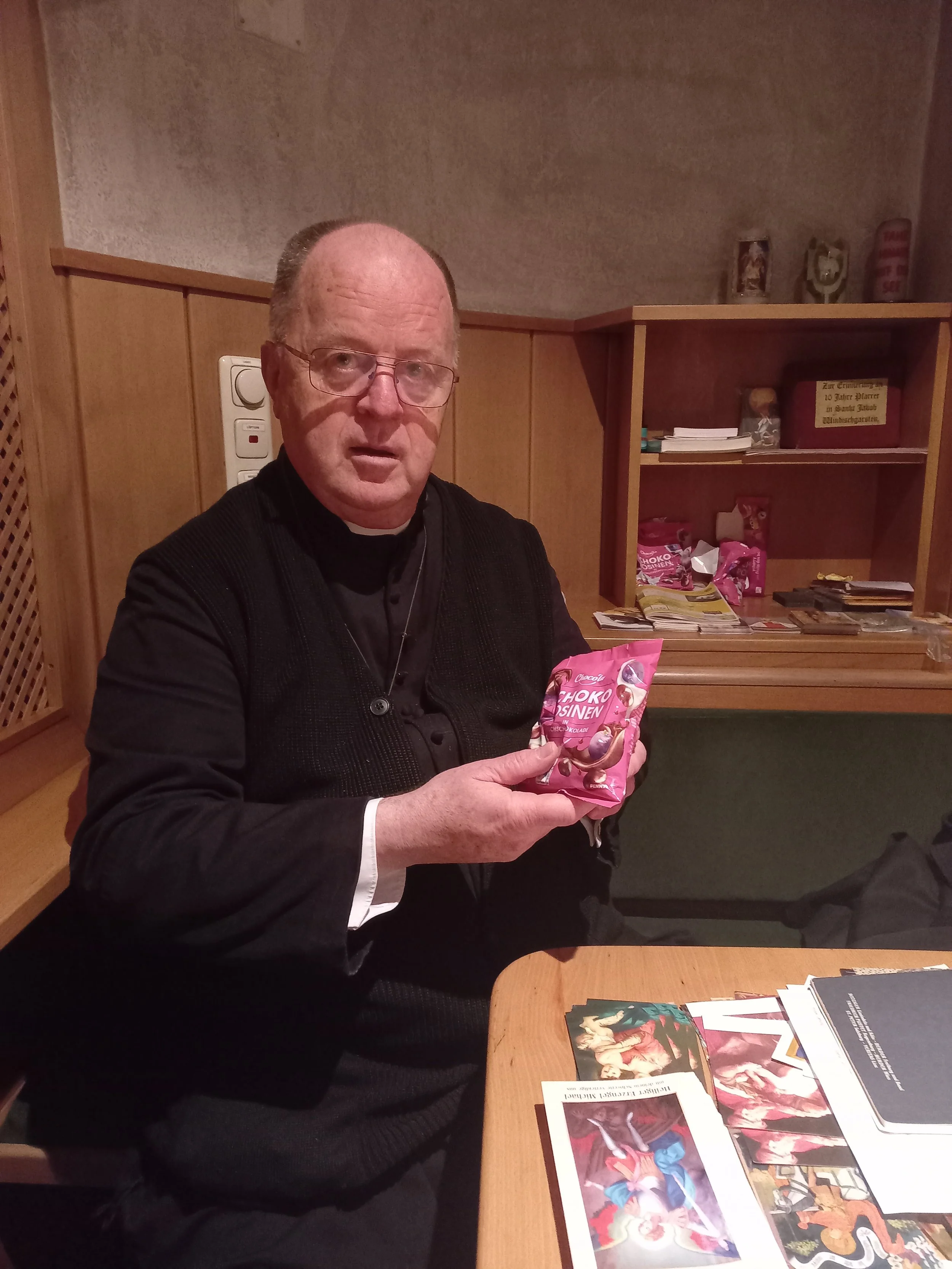Sein Aussprachezimmer ist gut geheizt, was bei der Saukälte ein Vorteil ist, und das Regal hinter ihm ist voll mit Schokolade. Die bekommt er von seinen Schäfchen als kleines Dankeschön für den Ablass, alleine daran kann man erkennen, wie gut er sein muss beim Beichte abnehmen.
