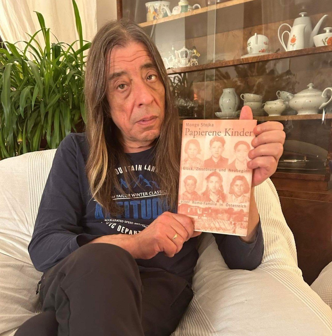 Nun zu Papierene Kinder, das sein Vater Mongo Stojka geschrieben hat: "Er ist ja in Auschwitz-Birkenau durch die Hölle gegangen", erzählt der Sohn. "Davon hat er manchmal erzählt, aber nicht oft. Ich habe gemerkt, dass er den Drang hat, zu reden, aber er wollte uns Kinder auch nicht damit belasten, sondern uns mit einem positiven Feeling ins Leben entlassen. Manchmal ist es ihn überkommen, dass er was sagen musste, aber dann hat er wieder monate- oder jahrelang geschwiegen. Wenn man als Dreizehnjähriger sieht, wie andere Kinder lebendig ins Feuer geworfen werden; wie Menschen nackt durchs Lager zu den Erschießungskommandos getrieben werden; wie Menschen angestellt vor der Gaskammer stehen und als Rauch beim Schornstein herauskommen – das ist so monströs." Eines Tages sagte Harri zu ihm: "Papa, warum schreibst du es nicht auf?" Das tat er dann mit diesem Buch, und so konnten auch die Kinder endlich Dinge erfahren, die der Vater ihnen nie erzählt hatte.