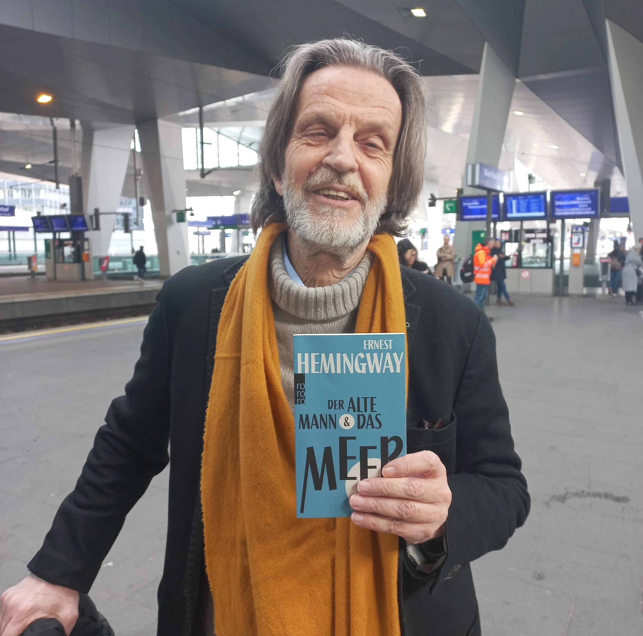 „Im Prinzip bewege ich mich in meiner Lesewelt von Hesse über den Fänger im Roggen bis Bukowski - solche Sachen. Dann hat mich mal DIE ZEIT angerufen, ich soll für eine Literaturbeilage über Der alte Mann und das Meer schreiben, und ich hab das nochmal gelesen nach zehn Jahren. Das ist stilistisch unerreicht, wenn er so beschreibt die Angelschnur oder das Ruder, da sitzt jeder Satz. Die berühmten kurzen Sätze! Genauso gerne mag ich aber Wem die Stunde schlägt, das bewundere ich. Da treibt der eine Geschichte in Dialogen voran, nicht so wie ich, wo ich schreibe: da passiert dieses und jenes, und dann sagt mal einer einen geilen Satz, und dann passiert wieder dieses und jenes. Nee, der lässt Leute reden, und dazwischen kommen kurze Einschübe: Wenn sie raus aus der Höhlung in die Lichtung kommen, da reichen ihm zwei, drei Sätze, und du siehst die Lichtung! Dann wieder Dialoge…“