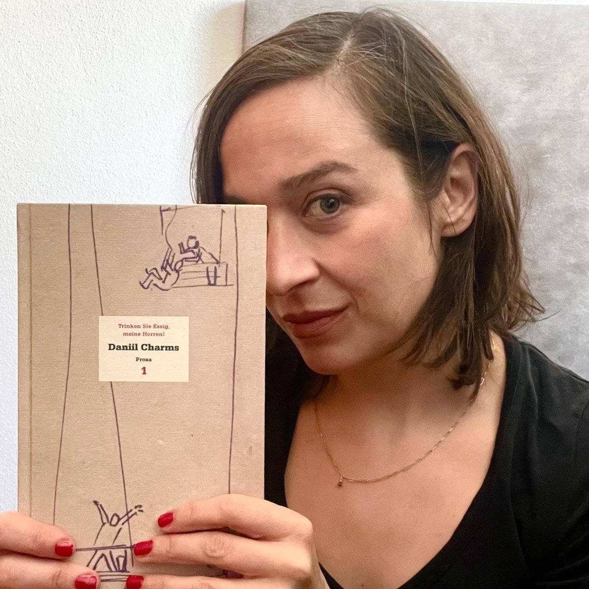 Dabei hat sie auch nichts gegen gut gereifte Literatur von Männern, zu der sie immer wieder gerne greift: Auf den großen Daniil Charms kommt sie als von Grund auf humorvoller Mensch immer wieder zurück, „denn der hat auch Humor als Überlebensstrategie gewählt, unterstelle ich ihm mal.“ Und das wohnt ihr eben auch so ein bisschen inne: „Ich mag es, wie er Sinn und Unsinn und Witz und Verzweiflung und Schmerz zusammen mischt und dabei intelligente Prosa und Lyrik schreibt. Diese absurde Art von Humor wie in Trinken Sie Essig, meine Herren! kommt der Wahrheit oft viel näher als Literatur, die so klar auf etwas verweist.“ Selbstverständlich hat sie auch ein Lieblingsgedicht von ihm, das sie als Schauspielerin schon oft als Vorsprechmonolog verwendet hat, es steht in Das Blaue Heft Nr. 10.