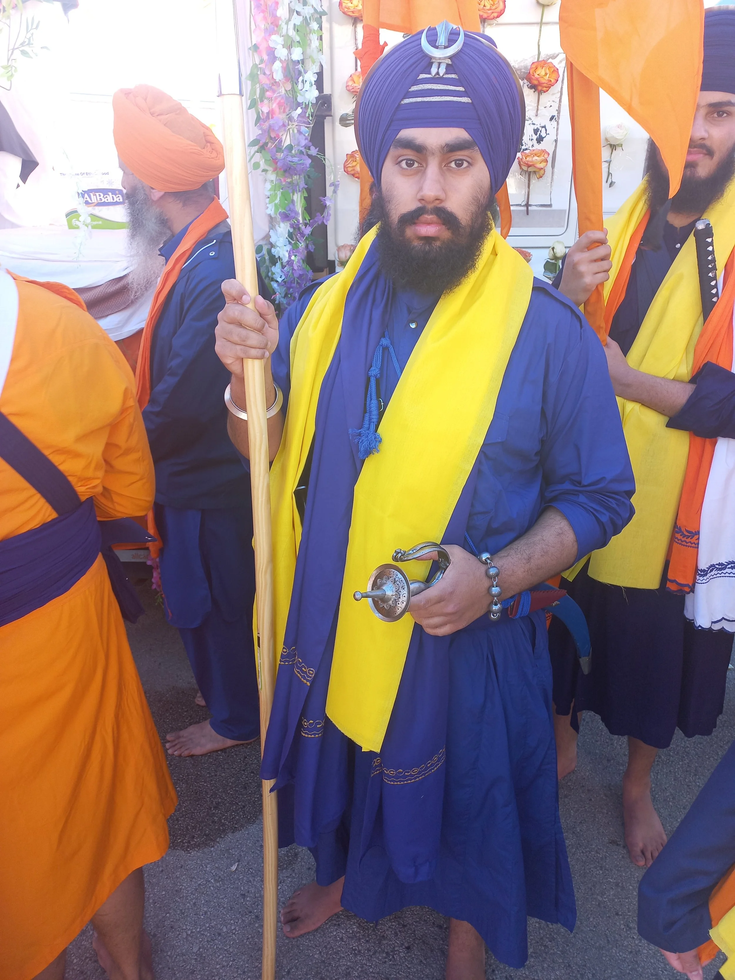 Alle Waffen, die er heute trägt, dienten traditionell zur Selbstverteidigung: Der Speer ist aus Stahl, der Degen heißt Kirpan, das kleinere Messer dient zur Opfergabe, „denn wenn wir essen, opfern wir etwas den Göttern. Und der Stoßdolch Katar ist einzigartig für den Indischen Subkontinent.“