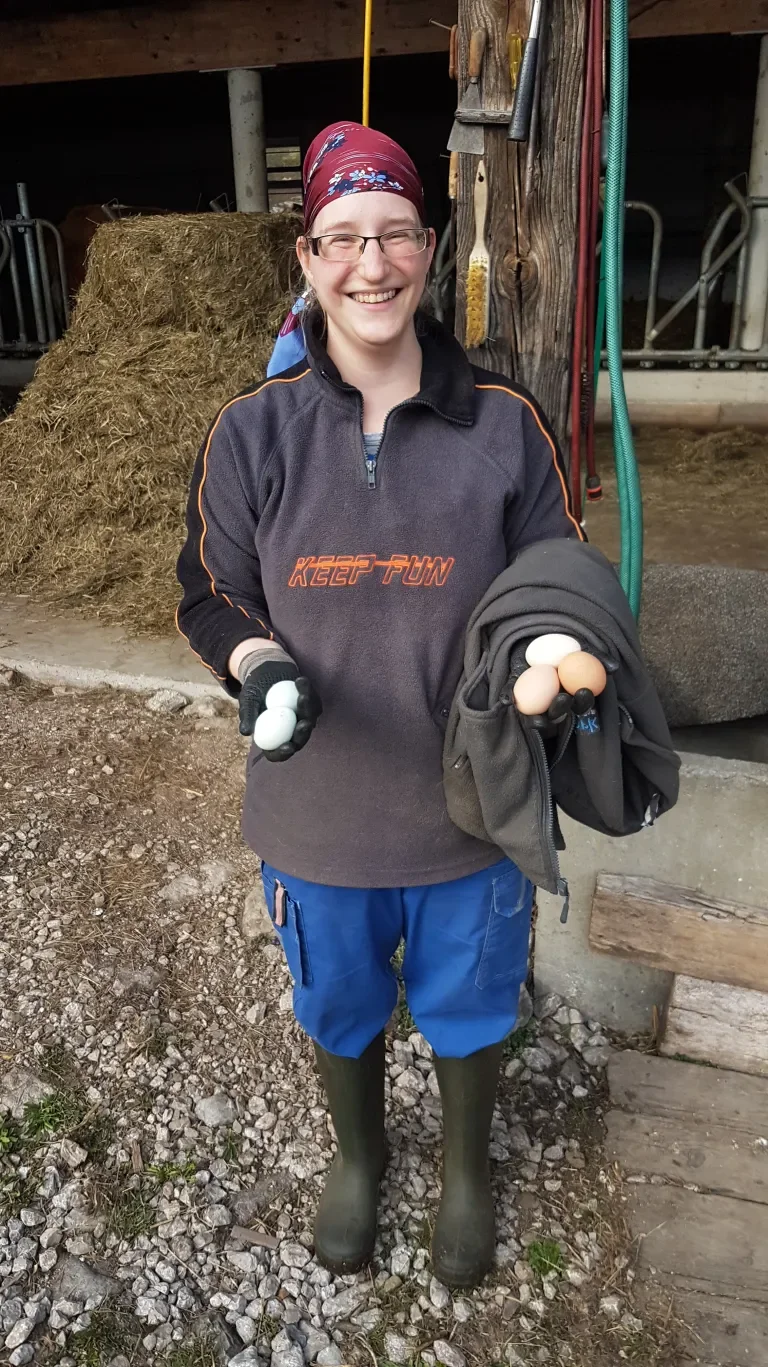 Der Biohof wird von drei Verbänden kontrolliert, mittlerweile sogar von einem deutschen, weil der regionale Verband die Biomilch nicht mehr vermarkten kann. „Eigentlich“, sagt Tante Mizzi, „ist es zum Aufhören.“ Sie machen trotzdem weiter mit zehn Kühen („Sonja, Samantha, Orchidee, Cindy, Susi, Milli, Sterndl …“) und fünf Kälbern, die im Sommer auf der Alm sind. Dazu ca. zehn Hendl, die ca. fünf Eier pro Tag legen, und gleich drei Hähnen, „damit die alten Herren nicht überfordert sind.“