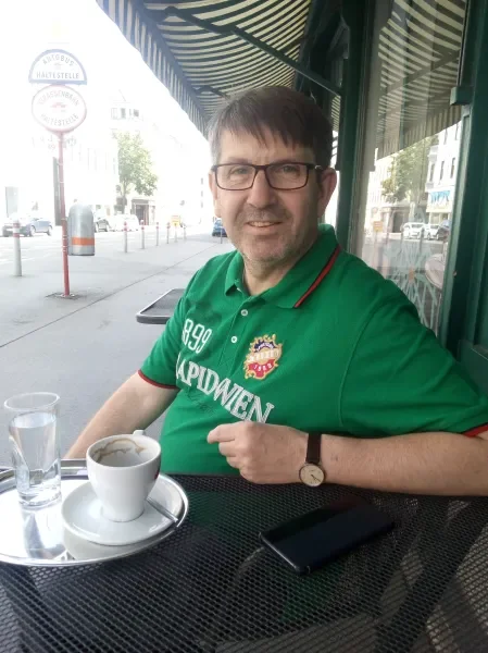 Als Peter das erste Mal „da vorne an der Kreuzung ausstieg“, sagte er sich: „Na i waaß net, ob i do wohna wü.“ Jetzt will er nicht nur nicht mehr weg, sondern sitzt sogar für die ÖVP im Bezirksparlament, als Fraktionsvorsitzender, der Anträge einbringt und für die Kommunikation mit den anderen Parteien sorgt. Die Zusammenarbeit war anfangs nicht ganz leicht, bis man sich kennengelernt hat. Die Grünen, die hier sehr stark sind, wären dabei am wenigsten kommunikativ, „das ist halt ihre Art. Sein grünes Rapid-shirt trägt er heute, um eine andere Stammgästin (eine Austrianerin, die gerade vom Friseur kommt), ein bisserl zu ärgern. Aber es ist auch dem Umstand geschuldet, dass man „im 15. und 14. Bezirk einfach der Rapid angehörig sein soll“. Schon der Schwiegervater fuhr aus OÖ zu den Spielen herunter.