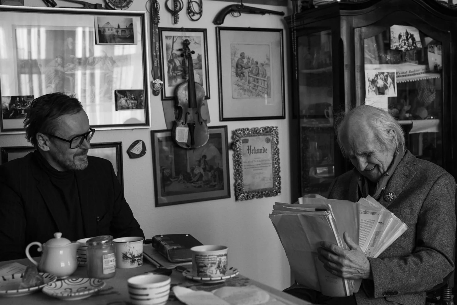 Der habilitierte Wiener Kulturforscher Prof. Dr. Roland Girtler empfängt in seinem mit Büchern und Sammelstücken aus der ganzen Welt vollgestopften Büro in seiner Wohnung am Wiener Spittelberg. Er trägt einen Wildererhut und nimmt für uns eine alte Wildererbüchse auseinander, obwohl er natürlich streng gegen Waffen ist. Dann singen wir gemeinsam ein Wildschützenlied: „… nur ins Essigfasserl ham sie net einigschaut, do woar mein Büchserl drin und von da Gams de Haut …“