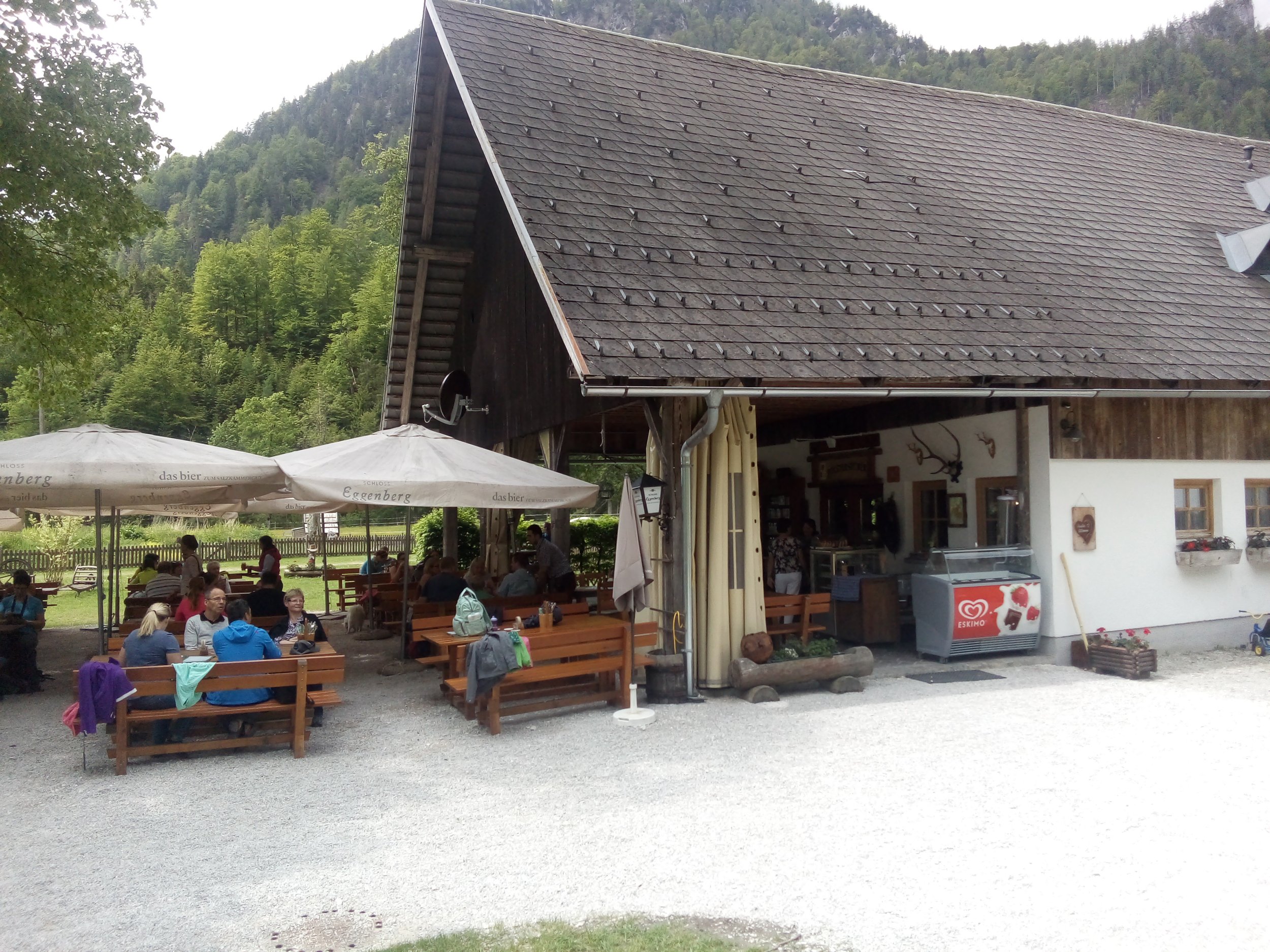 Die Kellner tragen erste Kaspressknedl herum, Bratl mit Kraut oder Hirschgulasch. "Griaß di, griaß eich, griaß Gott!" und "Hello!" für den Wamperten im Uncle-Sam-Shirt. An der Budel kann man sich Cremeschnitten holen oder Bauernkrapfen mit Marmelade in der Mitte und reichlich Zucker drauf. Die gehen aber besser bei kühlerem Wetter, sagt die sehr sympathische Fachkraft, die Cremeschnitte dafür besser bei heißem. Hinten am alten Gebäude gibt es eine Ladestation, und vorne am Spielplatz turnt eine kleine Ella, die aber anders heißt: "Lilly, pass auf!"