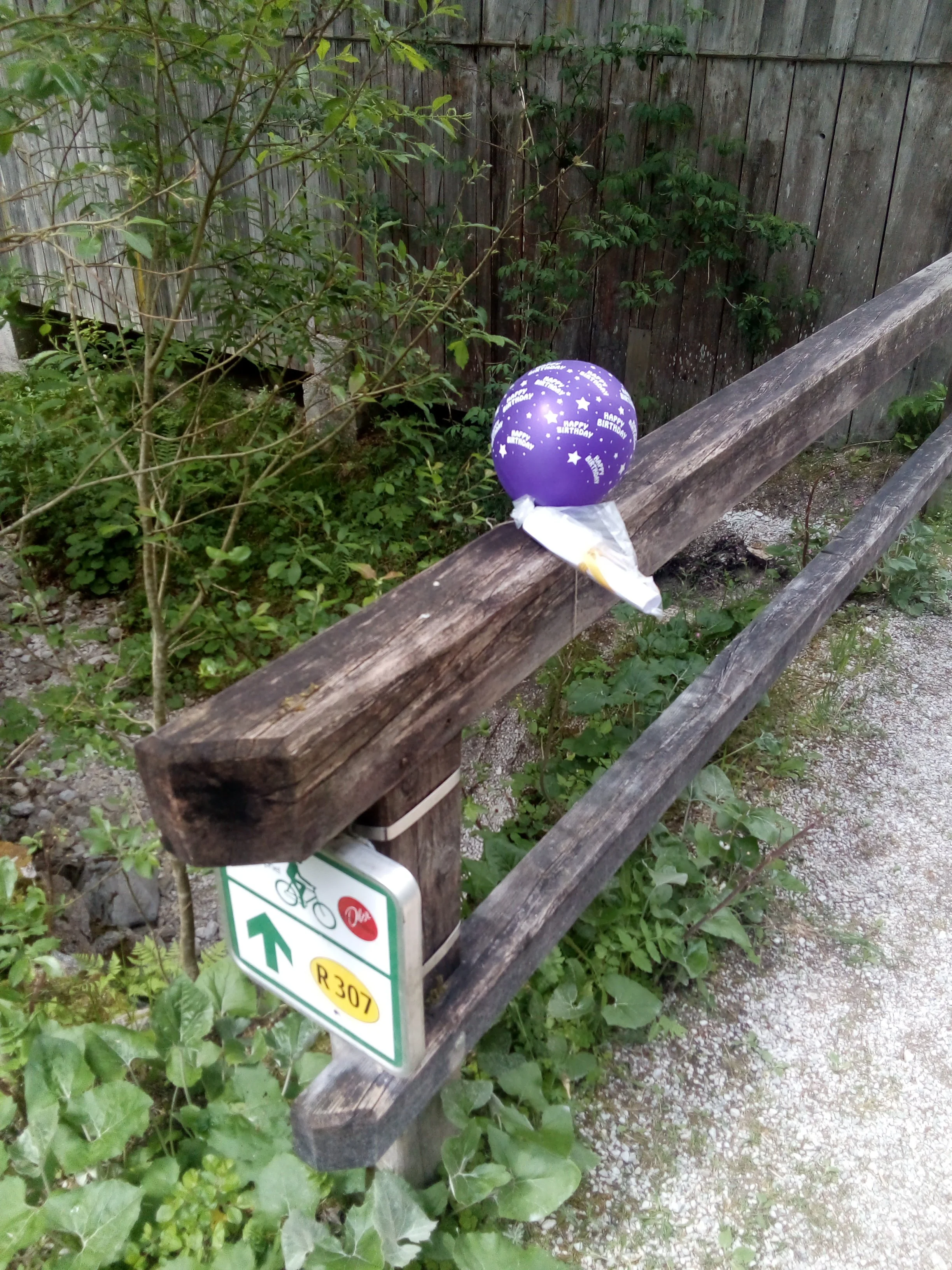 Wir betreten den Wanderweg über eine Holzbrücke, an deren Geländer ein erster Ballon hängt, einer von vielen, die wir am Weg noch an Bäumen und Sträuchern sehen werden - Kindergeburtstagsfeierüberbleibsel. Das Private wird immer weiter ins Öffentliche hinausgetragen, aber kaum ist es draußen, muss man es wieder einfangen: "Ella, komm her!" "Ella, geh nicht so schnell!" Und vor allem und immer wieder: "Ella, pass auf!" Die Natur, so schön sie ist, so gefährlich ist sie natürlich auch.