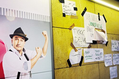 An dieser Wand des Bahnhofs erlebt auch der gute, alte, weiße DIN-A4-Zettel in Kombination mit dem Edding seine wohlverdiente Renaissance. In Zeiten totaler Vernetzung über Smartphone müssen Abfahrtszeiten der Züge und andere Informationen an die Wand geklebt werden, auch tragen viele Helfer einen Zettel an die eigene Brust geklebt, wo dann draufsteht, was man im Angebot hat: "English!", "Arab!" oder "Room to sleep".