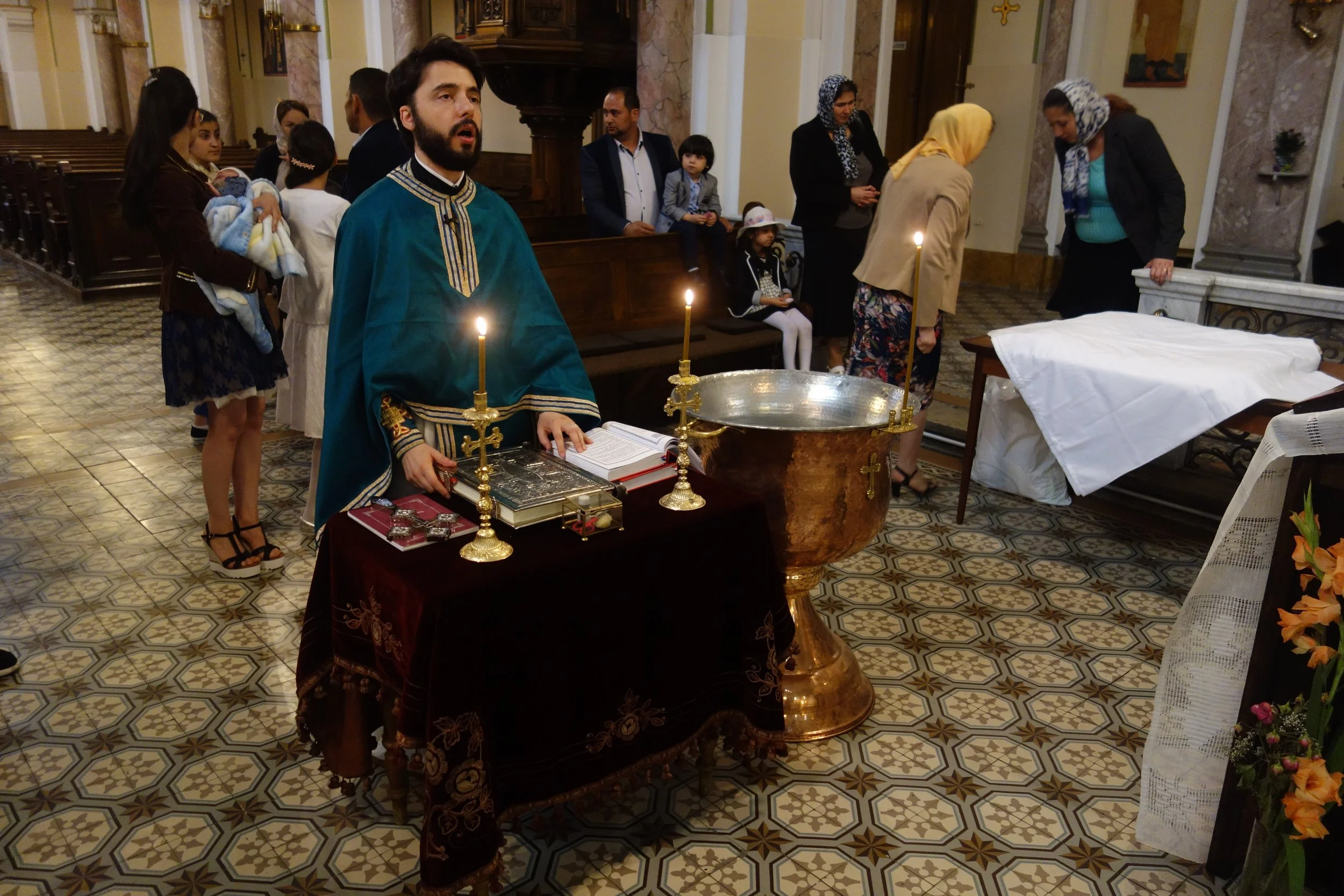 Bekreuzigen und Küssen, Niederknien und sich Bekreuzigen, immer wieder, während der Pfarrer noch mit Weihrauchkessel das ganze Kirchenschiff durchmisst. Der Schwung seiner Hand ist dabei locker, sein Schritt lässig, sein Blick zielgerichtet. Pfarrer Moga könnte mit seinem Hipsterbart auch hinter einer Weinbar im 7. Bezirk stehen. Nach dem Gottesdienst krempelt er sich die Ärmel hoch und nimmt eine Ganzkörpertaufe am kleinen Geraldo vor.